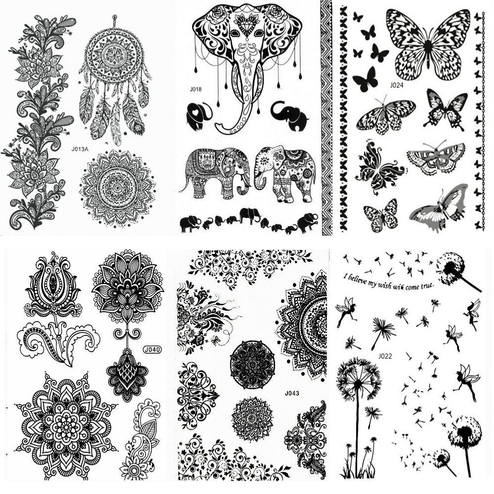 These henna tattoo stickers come as a set of six permanent tattoos and are best applied with a thin brush.